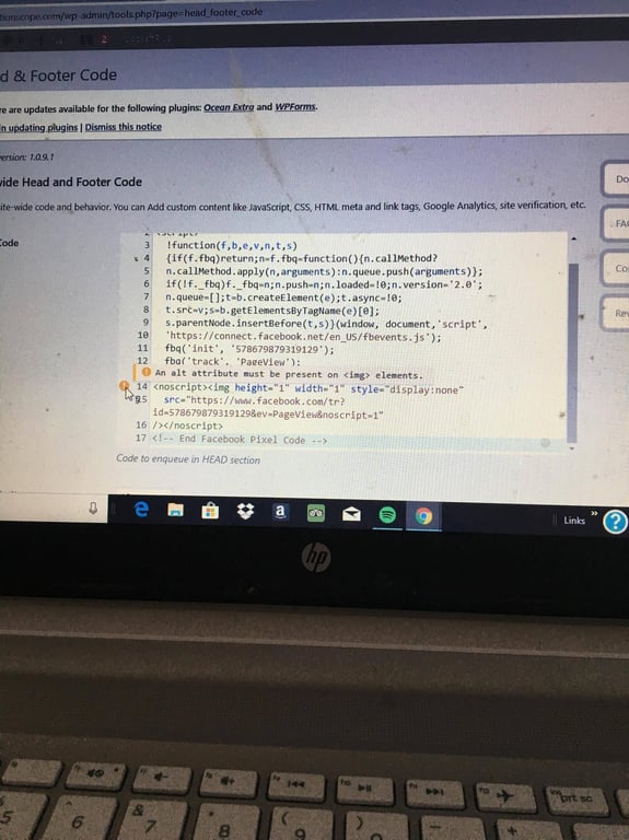 What does it mean and how to solve the problem in Facebook Pixel code? While I'm testing the Pixel it says "no activity likely due to an error in the Pixel base code" . Do I have to add an alt attribute?